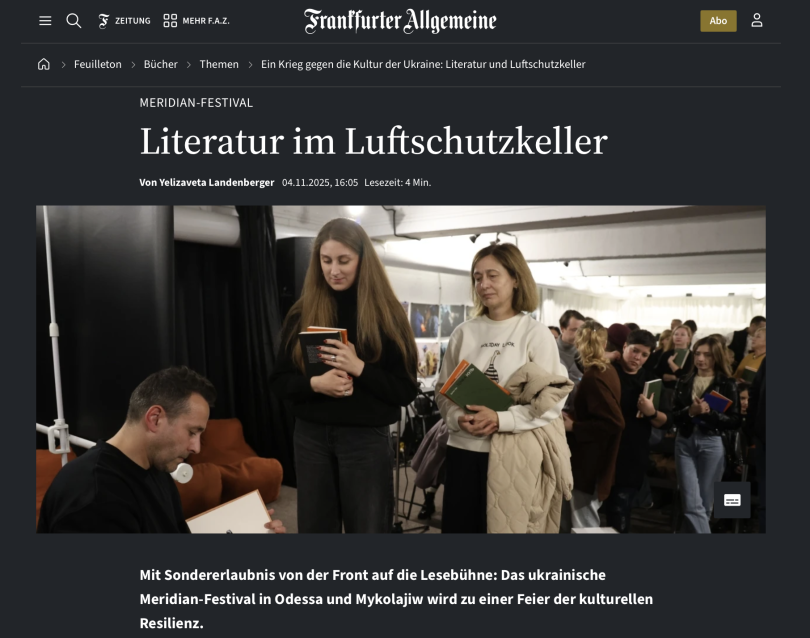 2010 initiierte der Unternehmer Swjatoslaw Pomerantsew das Literaturfestival „Meridian“ in Czernowitz, seit 2011 unterhält er den gleichnamigen Verlag, in dem Bücher namhafter ukrainischer Autoren erscheinen. Durch den Beginn des Krieges 2014 kam eine weitere Aufgabe hinzu: Kulturdiplomatie. „Das Ziel war, durch Literaturveranstaltungen über die Ukraine und den Krieg zu sprechen“, sagt Lopata. Seitdem organisiert das Meridian-Team im deutschsprachigen Raum und darüber hinaus Touren für ihre Autoren. Seit 2023 veranstaltet man zudem weitere Filialen des Festivals in Städten im besonders vom Krieg betroffenen Süden und Osten des Landes, in Charkiw, Saporischschja, Cherson, Mykolajiw und Odessa.